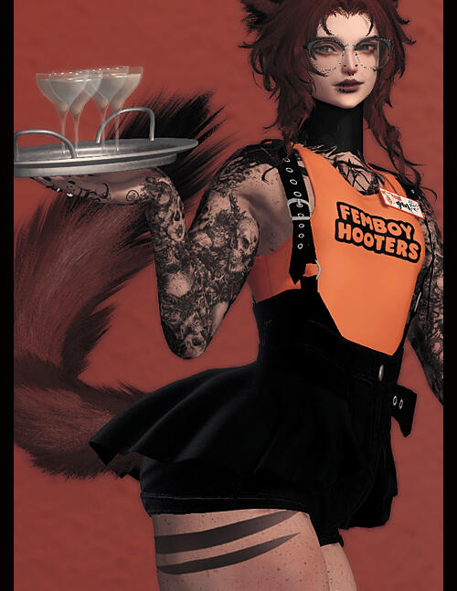 Passionate about a good drink and fine rumps, Medical "Med" Waste has found a second home at Femboy Hooters. Don't let their flirty exterior fool you though. When they're not serving femboy finesse, you can find them hard at work treating Eorzea's most vulnerable populations. Alternatively, you might find them drunk in a corner of a number of bars.